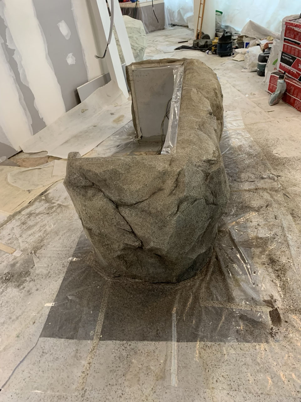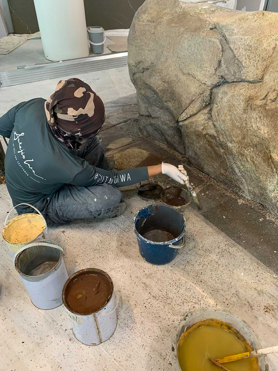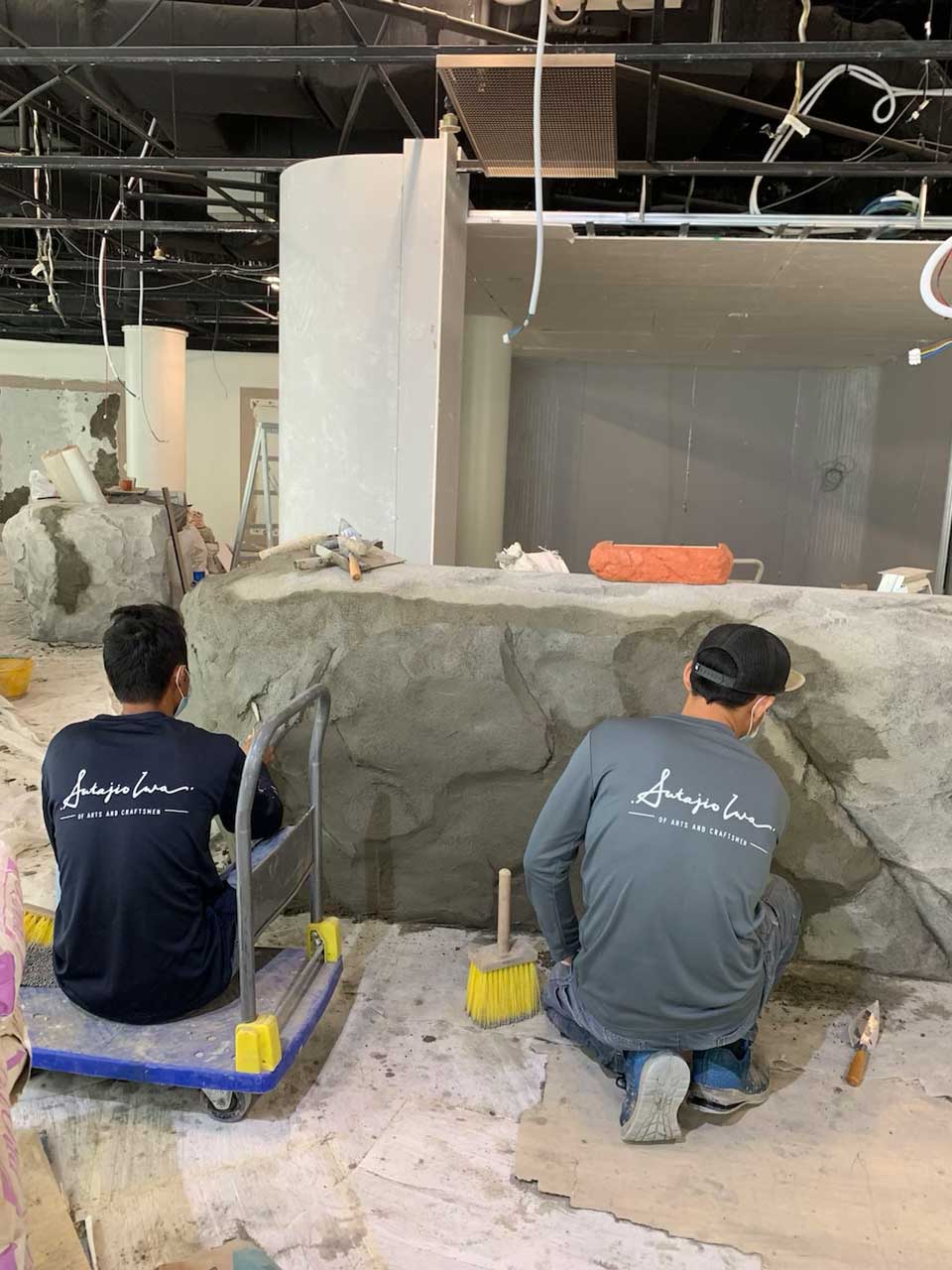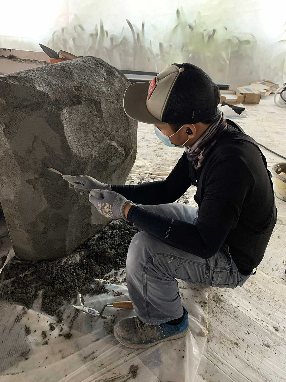 In situ carving to create two simulated rock boulder counters at Marguerite Singapore, Flower Dome, blending natural beauty with fine dining.